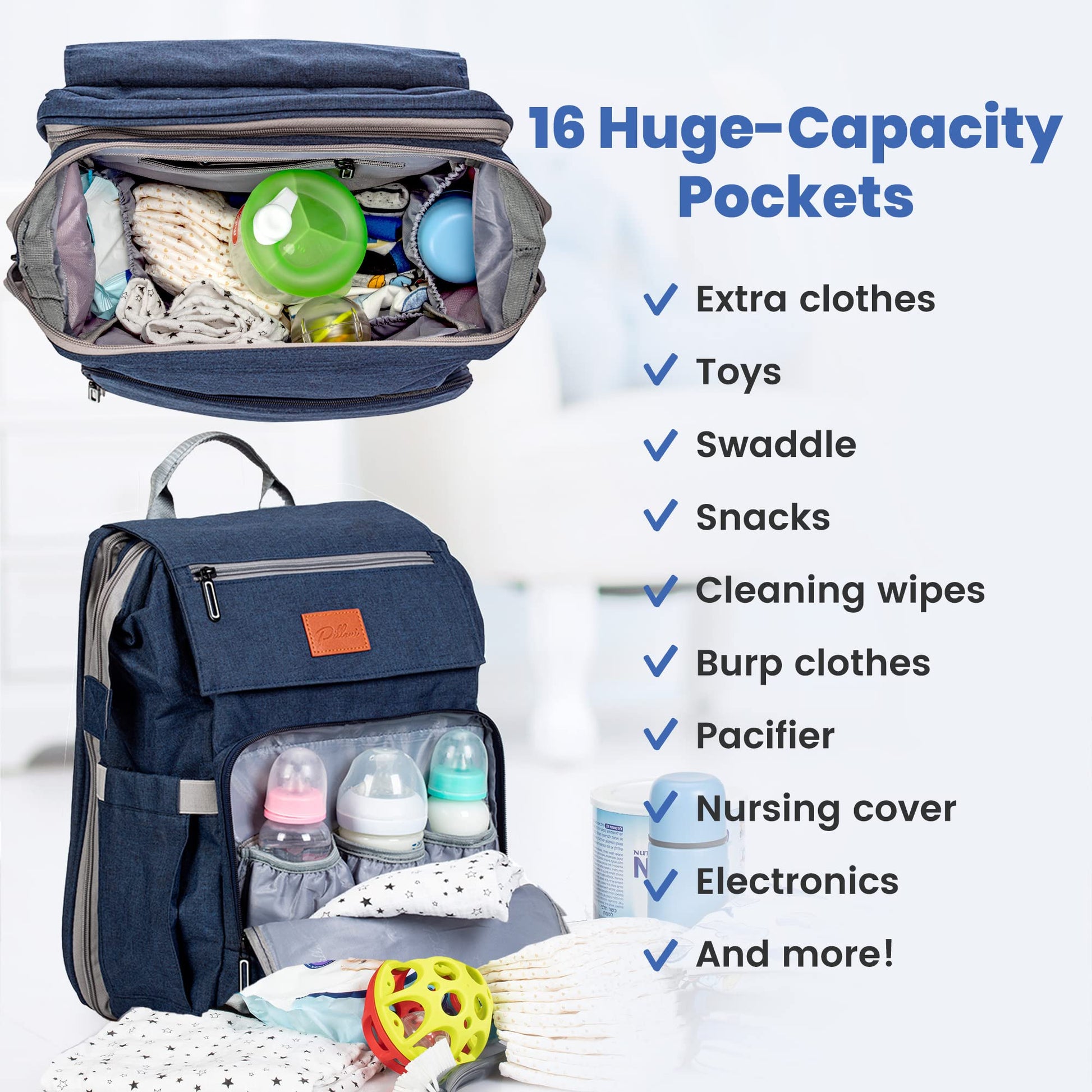 - 【Exceptional Design】- Organize all the baby stuff and access it at an arm's reach! Featuring 16 function pockets, you'll definitely have room for all newborn essentials must haves! The front is designed with a large flap zipper pocket, and a key loop where you can attach the house and car keys - with no need to access the main compartment. It has 3 insulated pockets that can hold most baby bottle brands, while the elastic side pockets are also suitable for water bottles, wipes, tissues & more!