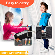 - Mess-Free & Multipurpose Entertainment Gear: Designed with a 15.5-inch wide x 12-inch deep erasable drawing platform that doubles as a food tray, so kids won't have to switch places when they get hungry. It has a water bottle holder to keep your child's beverage in easy-reach access. It has a 1.5-inch wide adjustable carrying strap with a shoulder pad for a comfortable and strain-free carry. Its extra high side walls are made ideal for kids, measuring 12-inch in length and 4-inch in height.