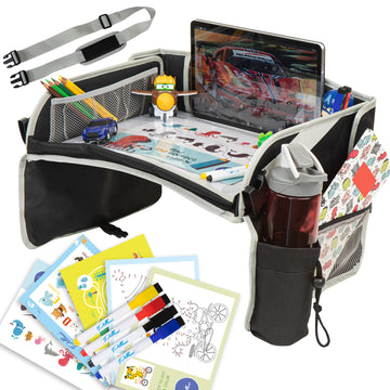 - Portable Carseat Tray: Our car seat tray for toddlers has a compact size of 16.5 x 13 x 4.5 inches with easily accessible organization pockets. It sits securely on a child's lap and allows kids to enjoy road trips while drawing with their art supplies, having snacks, or playing with their favorite toys. This car set will give parents the advantage of enjoying a quiet ride while their kids stay entertained when traveling or during airplane flights!