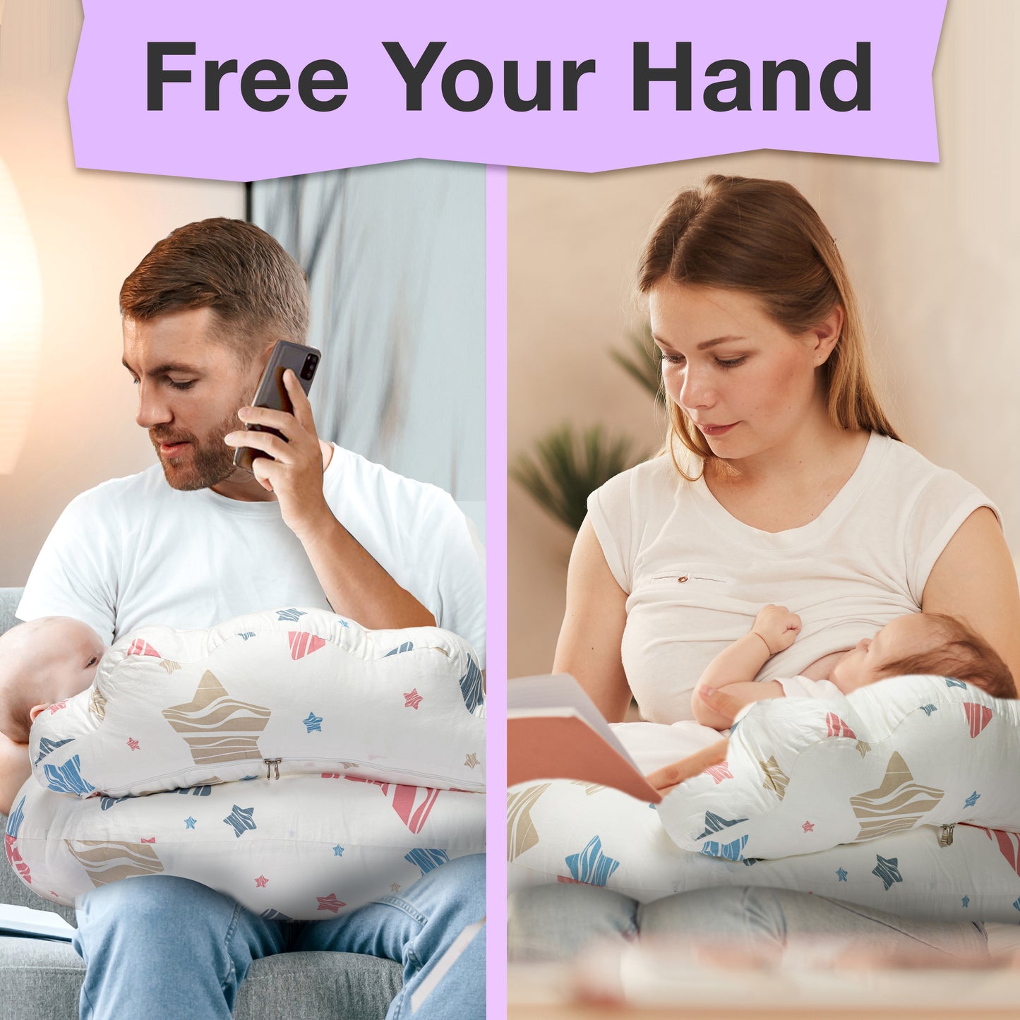 - [Free you hands] Our innovative breastfeeding & bottle pillow is designed to amplify your baby's comfort. This pillow also provides a remarkable benefit to mothers - freeing up their hands for other tasks. Imagine having the freedom to tend to your little one's needs while having one hand available for multitasking, whether it's drinking, reading, speaking on phone, or simply enjoying a moment to yourself. Kindly note, this product is intended for supervised nursing only, not for sleep.