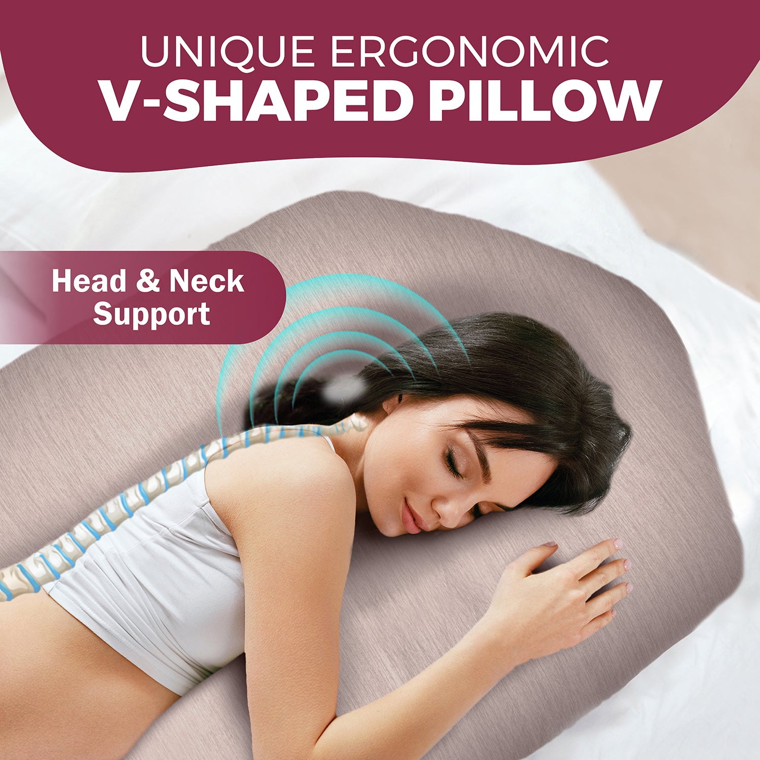 - 【360° Full Body Support】– Our unique, patented U+V+C-shaped pregnancy pillow is the only one on the market, designed to provide unmatched comfort and stability. The V-shape offers extra neck and head support, the C-shape cradles the lower body, and the U-shape supports the upper and lower back. Wrapping around your body from all angles, it ensures a restful and rejuvenating sleep like no other!