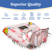 - With 2 adorable designs to choose from, Stars and Dinosaurs, it’s ideal for boys and girls. Our seat cover is also designed with 2 snack pockets, a bottle/cup holder with strap, smartphone pocket that fits most phone sizes, 2 toy loops for hanging toys, and a large pocket for extra baby essentials. It's compact and easy to install and carry, measuring 31.5" x 40" that's spacious enough but still travel-friendly. It can be folded into a lightweight pillow.