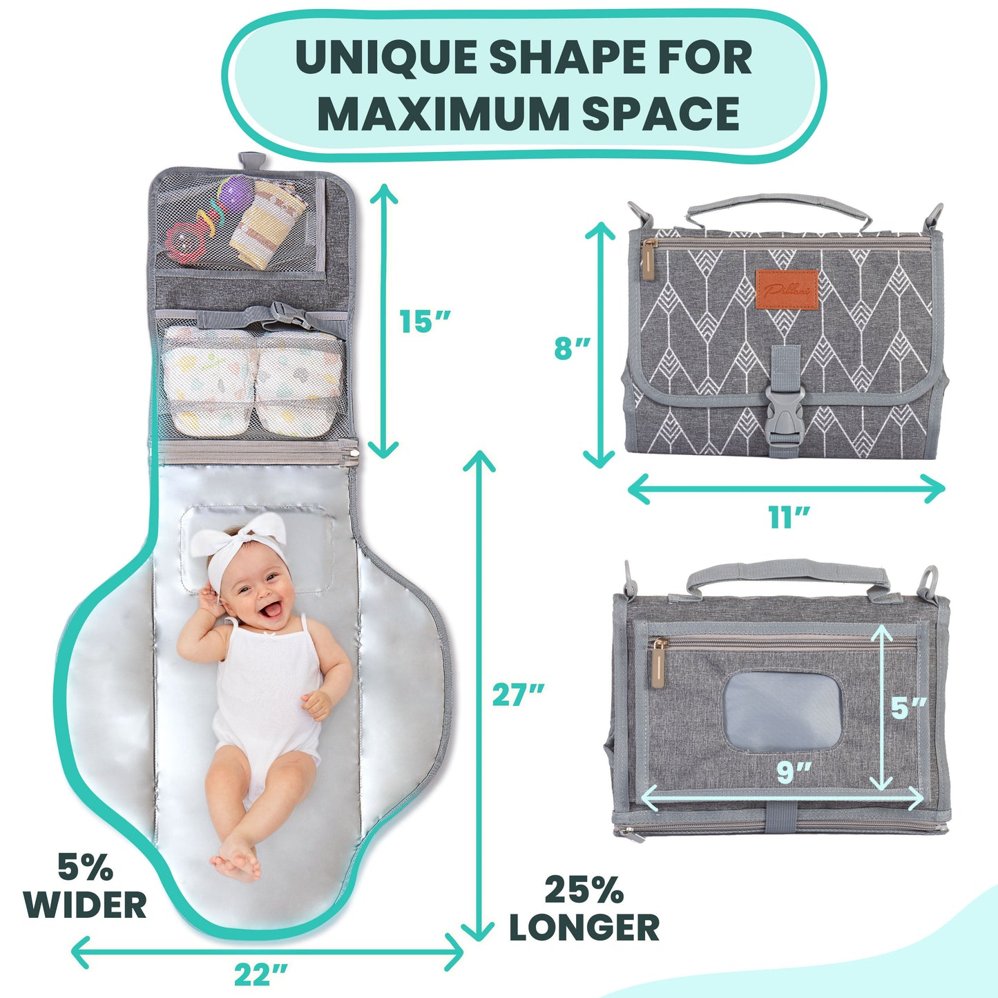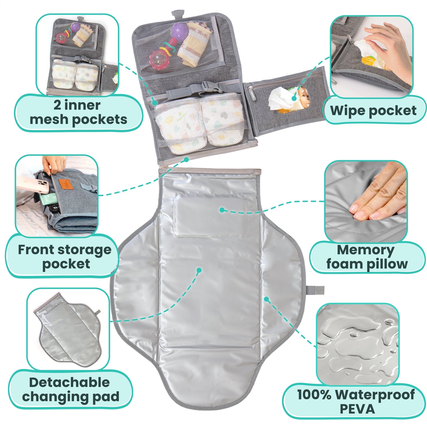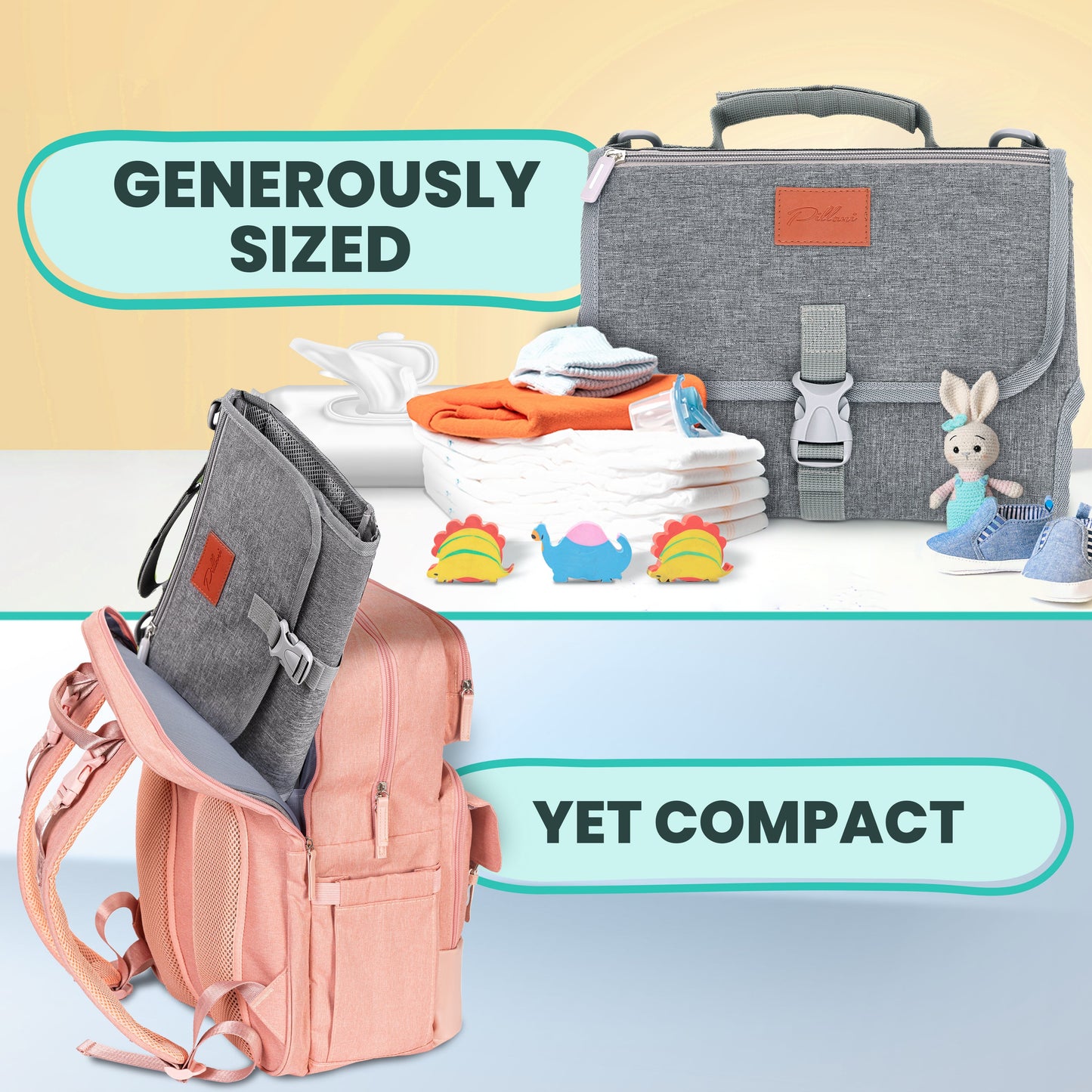 - Generously Sized yet Compact: Organized baby essentials with 2 inner mesh pockets, front storage bag (key holder and outer pocket), and easy-access wipes holder. Experience hassle-free diaper changes blending versatility and comfort. Our diaper changing mat is padded with a soft memory foam pillow. You can detach this extra storage space when you just need a simple changing pad! Equipped with a spacious 27” by 22” changing area, it folds into a compact 8" by 11" clutch for easy storage.