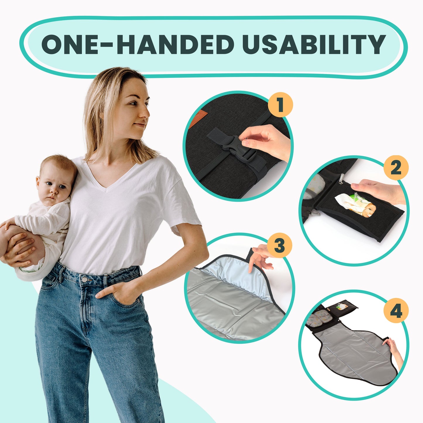 - One-Handed Usability: Unleash the ease with our Travel baby changing pad. Boasting a rapid-open buckle that allows you to effortlessly fold/unfold the changing mat single-handedly while holding your baby. It's perfect for busy parents, making diaper changes ideal for on-the-go moms and dads. This baby changing mat is tailored for swift and convenient diaper changes on your terms. Embrace ease, comfort, and style with our innovative changing pad.